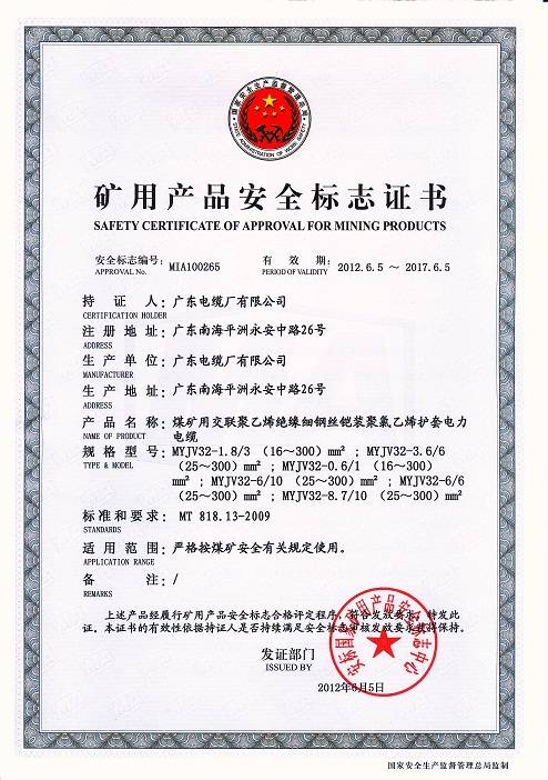 • 廣東電纜礦用產(chǎn)品安全標(biāo)志證書(shū)